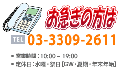 お電話でのお問い合わせの場合、03-3309-2611 メールでの問い合わせの場合、こちらのページからの書き込みが簡単です。 こちらをクリックするとメールソフトが動きます。 |